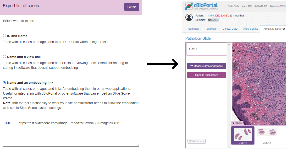 How to get your slides in cBioPortal? Slide Score users who can download results or access study administration will see a new button Export List when viewing details of a study. This will show a dialog that allows copying a list of all slide or case names in the study and their corresponding embedding link. These links can be imported in cBioPortal as a "resource" linked to a sample or patient. Sample or patient view in cBioPortal will then show a new tab that contains a basic Slide Score viewer and a link to open the slide in Slide Score to be able to score it and access all other functionality.