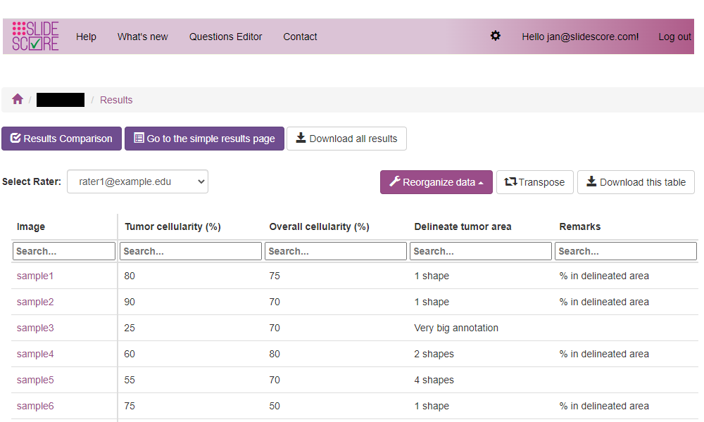 Slide Score provides a lot of options that control various aspects of scoring the set of slides, access to results or anonymization. A cool new feature is "scoring together" - when there are too many slides for one pathologist you can give access to multiple and enable scoring together so that when a slide is scored by one pathologist the others also see it as scored. Alternatively, you can use the splitting function (saying "slides nr. 1 to 100 will be scored by rater A") to divide the work between them more explicitly and equally.